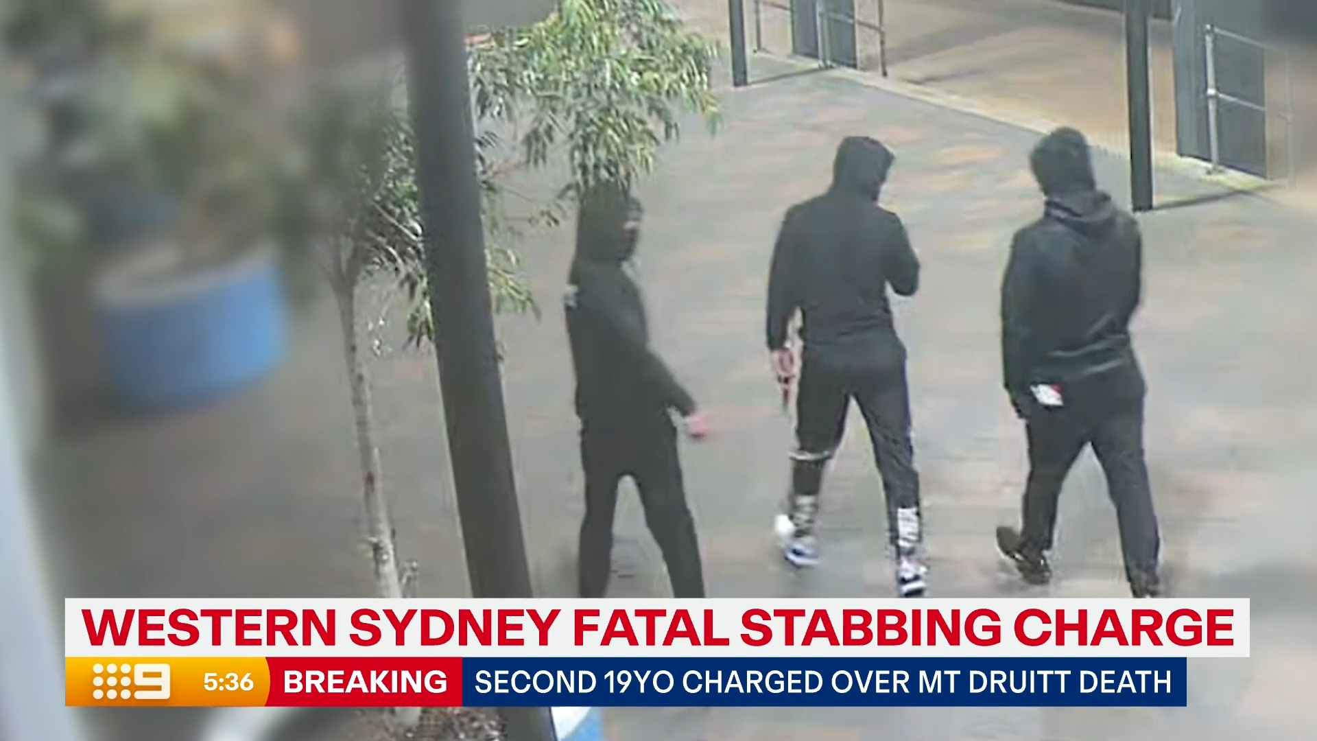 The trio, believed to be aged in their 20s, are seen walking along a street in Mount Druitt.
