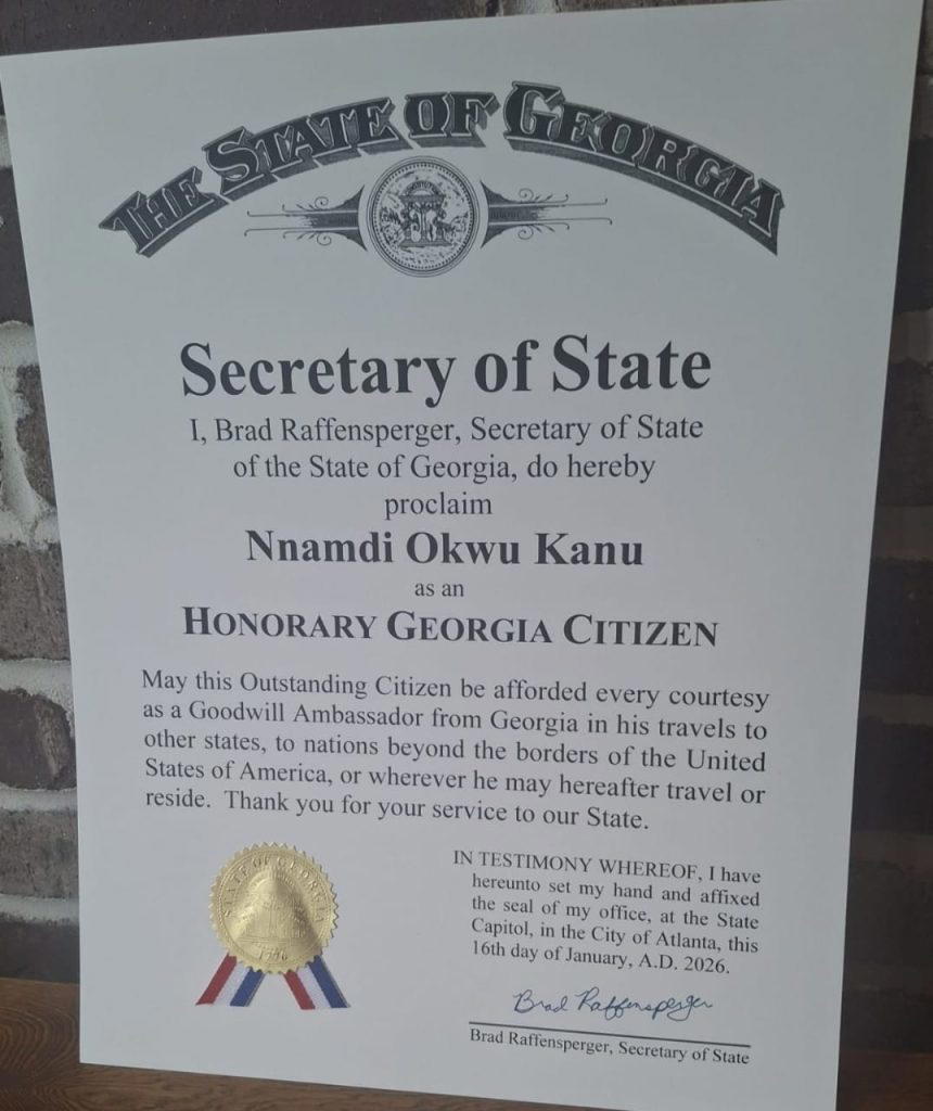 The detained leader of the Indigenous People of Biafra (IPOB), Mazi Nnamdi Kanu, has been conferred with Honorary Citizenship of the State of Georgia, United States of America.