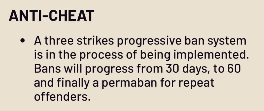 In the Anti-Cheat section of the patch notes, developers outlined a new “three strike” system for banning cheaters. Basically, you will be suspended for 30 days once you are caught cheating, then 60 days once you are caught cheating again, and then you will finally get permanently banned once you are caught a third time.