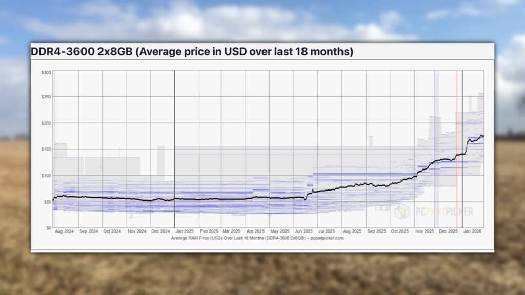 By this point in the timeline, we should have seen dirt-cheap DDR4 sticks. In fact, we did, for a time. In August 2024, a 16GB DDR4 kit rated at 3600MHz was around the $50 mark.