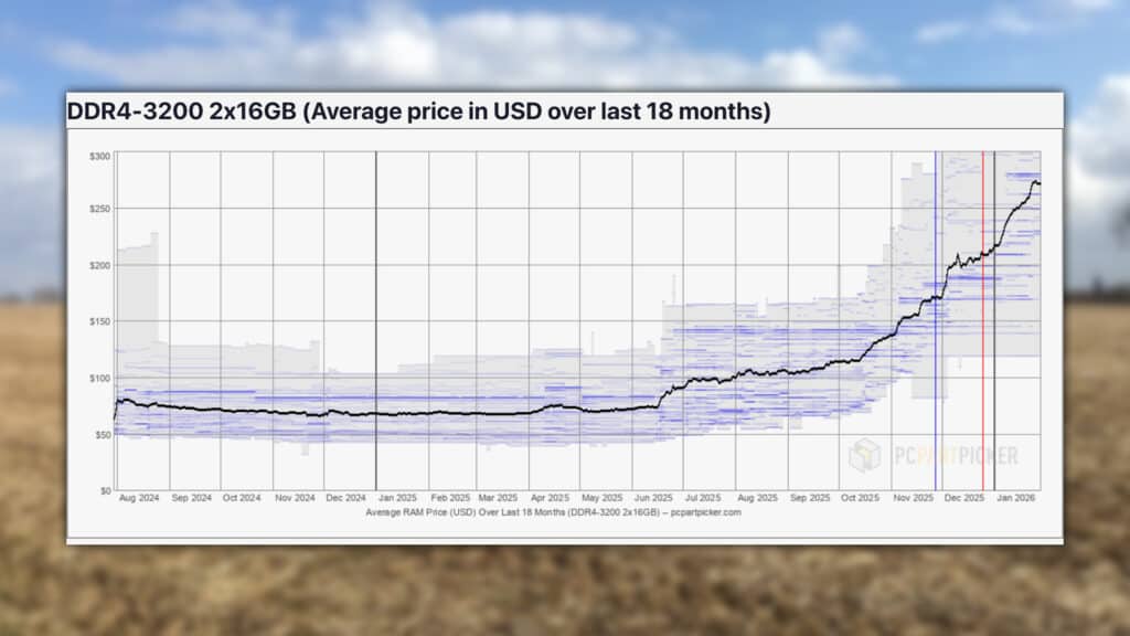 For those wanting more than 16GB, like 32GB, DDR4-3200 32GB kits shot up dramatically from July 2025, and have now reached the near $300 mark.